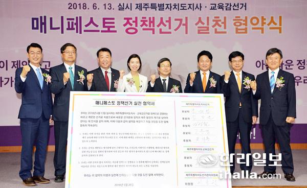 제주도선거관리위원회는 28일 제주상공회의소 국제회의장에서 매니페스토 정책선거 실천 협약식을 개최했다. 이날 협약식에는 문대림·김방훈·장성철·고은영·원희룡 도지사 선거 후보와 김광수·이석문 교육감 선거 후보, 도선관위 위원, 도지사(권한대행), 교육감(권한대행), 도의회 의장, 각 도당 대표 등이 참석했다.