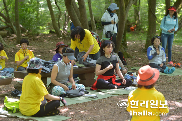 | 지난해 아홉번째 사려니 숲길 에코힐링체험에서 치유프로그램이 진행되고 있다. |