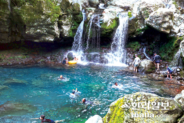 ▷돈내코 원앙폭포=두 개의 물줄기가 금슬좋은 한 쌍의 원앙 같다고 해서 붙여진 원앙폭포는 서귀포 돈내코 유원지 안쪽에 위치한 깊은 산 속의 천연 계곡 수영장이다.