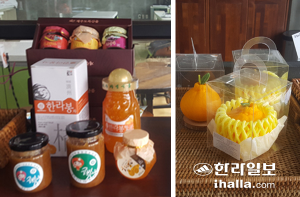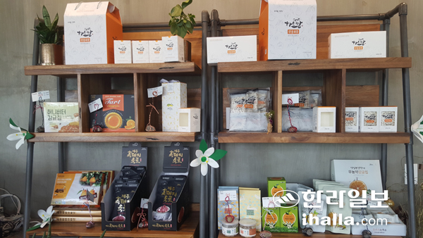 | '방귤당'에서는 감귤과즙, 감귤잼 등 감귤관련 가공제품과 제주특산품을 구입할 수 있다 |