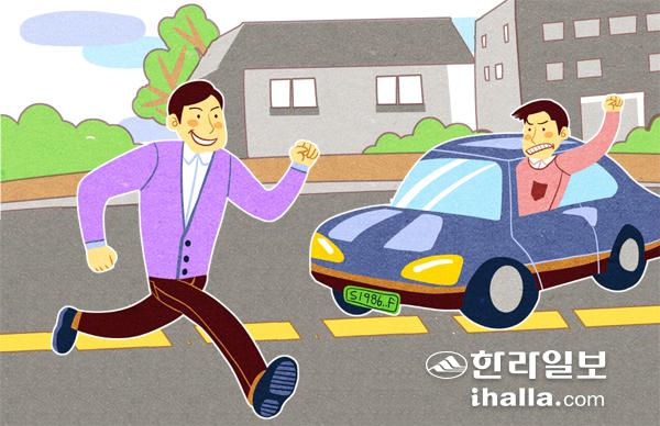 #A씨(40·제주시 거주)는 최근 신호를 받고 교차로 좌회전을 하자마자 앞차를 들이받는 사고를 낼 뻔 했다. 앞차가 급정지를 했기 때문이었다. 교통사고가 난 줄 알고 앞을 살펴보던 A씨는 어이없는 상황에 지금도 그때를 생각하면 화가 난다. 일행 3명이 줄지어 6차선 도로를 질주하고 있었다. 너무도 당당한 무단횡단 보행자였다.