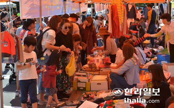 | 한라도서관 야외광장에서 '2017 독서사랑 책잔치'가 열려 도서관 장터에는 도서 등을 구입하려는 참가자들로 북적이고 있다. |