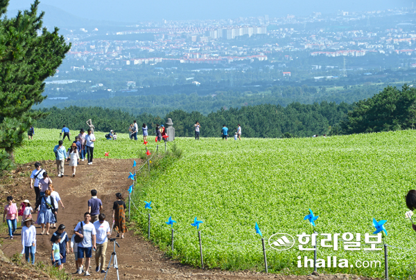 소금을 흩어뿌린 듯 촘촘히 박힌 하얀 메밀꽃이 절정을 이루고 있다. 제주는 전국 최대 메밀 산지다. 메밀은 척박한 제주 땅에서도 잘 자라고 제주토속음식인 빙떡이나 꿩메밀 칼국수에도 사용된다. 특히 오라동 메밀밭은 30만평 규모로 전국에서 가장 넓다. 메밀꽃밭에 파묻혀 연인과 함께 사진 한 컷 남겨보는 건 어떨까.