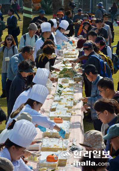 | 지난해 열린 감귤박람회에서 관람객들이 20.17m길이의 감귤케이크를 맛보고 있다. 한라일보DB |