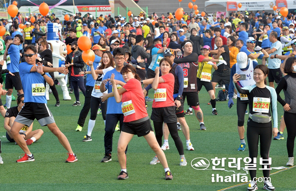 | 제주감귤국제마라톤 대회 출발에 앞서 참가자들이 흥겨운 음악에 맞춰 몸을 풀고 있다. 강희만기자 |
