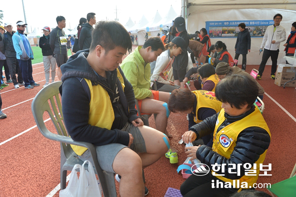 | 제주감귤국제마라톤 대회 출발에 앞서 참가자들이 테이핑 부스에서 테이핑을 받고 있다. 강희만기자 |