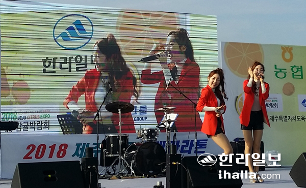 | 쌍둥이 인기가수 윙크가 11일 제주감귤국제마라톤대회 개막식에 앞서 축하공연에 나서 흥겨운 무대를 연출했다. |