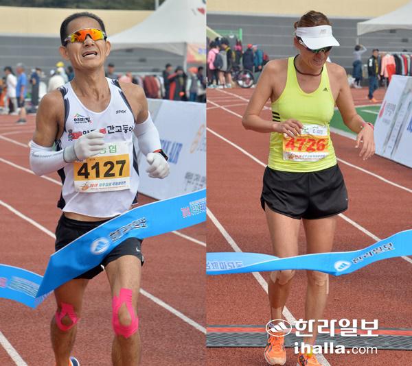 11일 제주시 조천운동장에서 열린 2018제주감귤국제마라톤 풀코스에서 남여부에서 우승한 권기혁(대구)선수와 류승화(충남)선수가 결승선을 통과하고 있다. 강희만기자