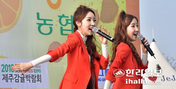 | 쌍둥이 트로트 가수 윙크가 11일 오전 제주시 조천운동장에서 열린 2018 제주국제감귤마라톤대회 출발에 앞서 참가자 응원을 위해 무대에 올랐다. |