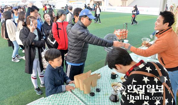 2018제주감귤국제마라톤 드립커피 코너에 길게 줄을 선 참가자들. 강희만기자