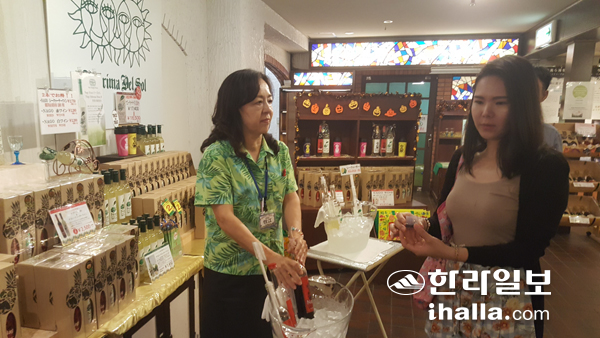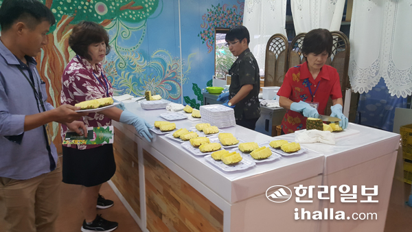| 파인애플 공장 판매점에서 직원이 가공식품을 판매하고 있다 |