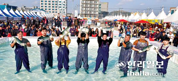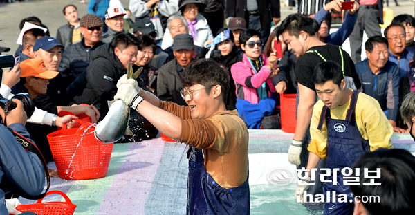29일 서귀포시 대정읍 모슬포항에서 개막한 제18회 최남단 방어축제에서 참가자들이 맨손으로 방어 잡기 체험을 하고 있다. 강희만기자