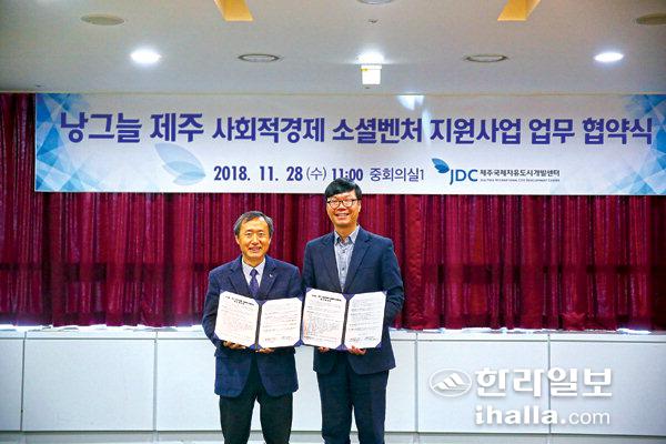 JDC는 지난달 28일 JDC 본사에서 엠와이소셜컴퍼니(대표 김정태)와 제주 사회적경제 소셜벤처 지원사업 '낭그늘' 추진을 위한 업무협약을 체결했다.