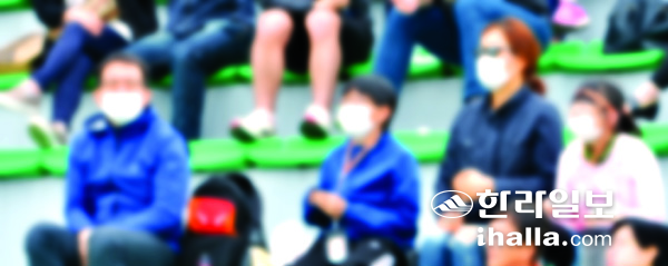 | 축구경기장을 찾은 관람객들이 마스크를 착용한 채 축구 경기를 지켜보고 있다. 사진=한라일보DB |