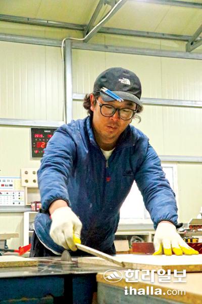 김경완 서광씽크·가구 대표가 서귀포시 안덕면 서광리에 위치한 자신의 공장에서 작업을 하고 있다.