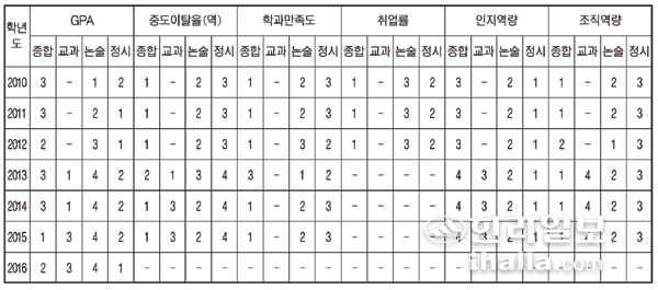 표2는 보다 다양한 부분에서 입학전형별 신입생들의 특성을 보여준다. 정시로 입학한 학생들은 꾸준하게 GPA(학점)과 인지역량에서 상위권에 위치했다. 전통적인 관점에서 우수한 학생, 즉 시험에서 우수한 성적을 받는 학생이라고 볼 수 있을 것이다. 하지만 정시 출신 학생들은 중도이탈율이 언제나 가장 높았고 학과만족도와 조직역량에서 하위권에 위치했다.