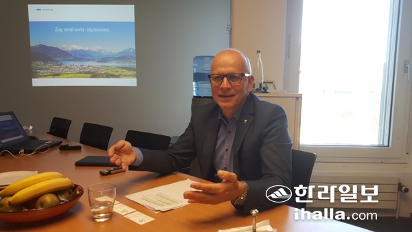| 추크 칸톤 바아트 바흐만 경제부장이 추크의 블록체인 및 가상화폐 정책에 대해 설명하고 있다. 고대로기자 |