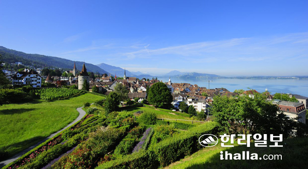 | 호숫가에 자리한 정부 청사 등 추크의 독특한 풍경들을 볼 수 있는 특별한 전망지점인 구기의 모습. 사진=추크 칸톤 제공 |
