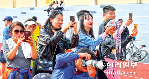 | 휴대전화 카메라로 마라토너들의 골인하는 모습을 담는 방문객들. 사진=특별취재팀 |