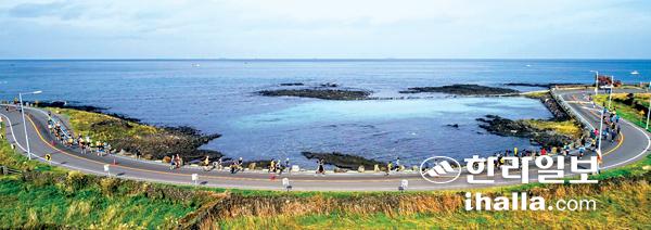 2019제주감귤국제마라톤 참가자들이 조천해안도로를 달리고 있다. 드론 촬영.