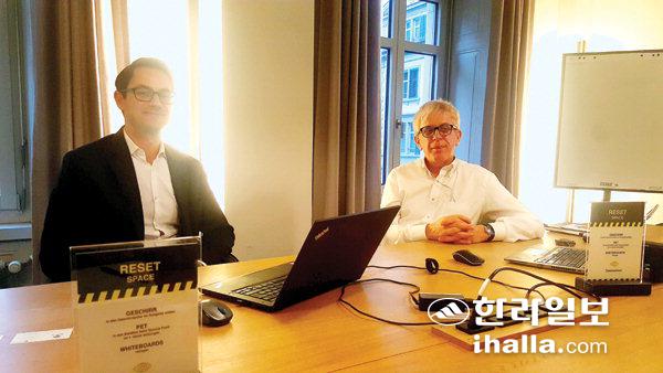 요하네스 훼너 스위스콤 본사 핀텍 사업 본부장(왼쪽)과 스위스콤 블록체인 자회사 루카스 홀 대표