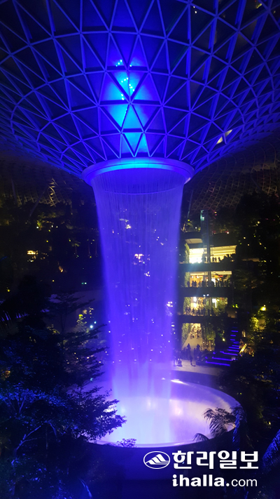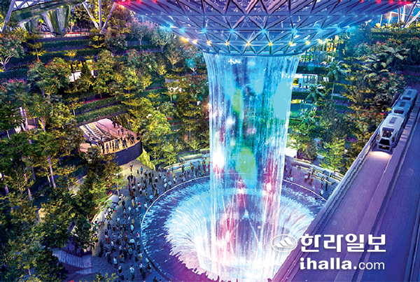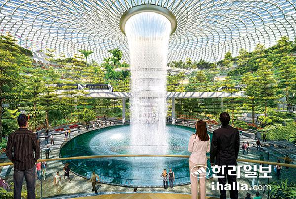 싱가포르 창이공항에 설치된 40m 높이의 세계 최고 실내폭포인 '레인 보텍스'(Rain Vortex). 이 폭포는 빗물을 활용하고 있다. 폭포수의 작은 물방울은 실내 공원생태계에 수분을 공급한다. 사진=창이공항 제공·고대로기자