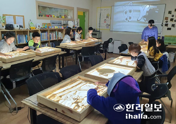 | 아동·청소년들이 모래예술(샌드아트) 수업을 받고 있다. 사진=해바라기지역아동센터 제공 |