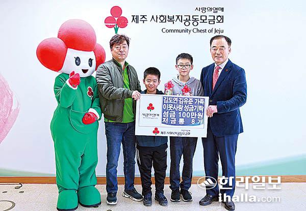 김성윤 알뜰농수산 대표와 그의 아들 김도연·김유준 형제는 지난해 12월 24일 도내 어려운 이웃을 위해 사용해달라며 성금 100만원과 저금통 8개를 제주사회복지공동모금회에 전달했다.