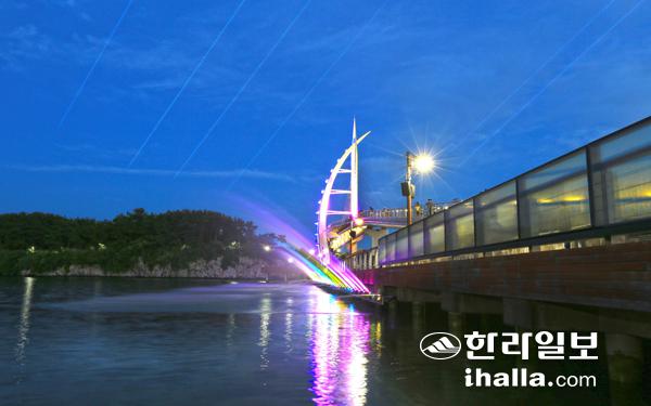 서귀포는 해 지는 어스름이면 회색빛 화장을 지우고 태곳적 모습으로 되살아난다. 사진은 새연교 음악분수. 사진=서귀포시 제공