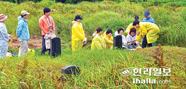| 벌초 후 조상의 음덕을 기리는 성묘객. 한라일보 DB |