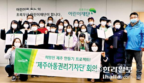 제주아동권리기자단 대표아동 및 가족들이 함께 '희망찬 제주 만들기 프로젝트' 동참을 약속하며 사진촬영을 하고 있다. 사진=초록우산 어린이재단 제주지역본부 제공