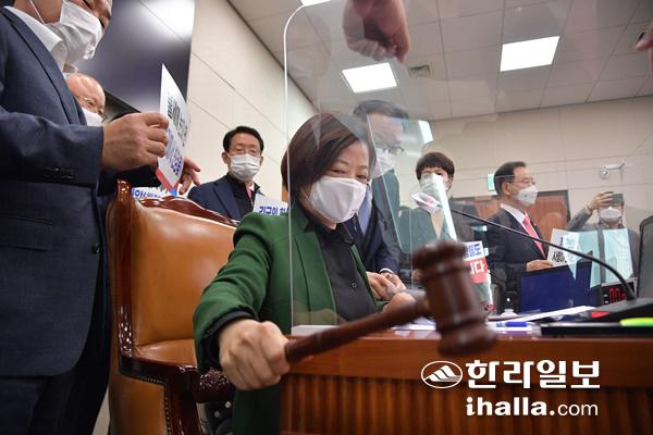 진선미 국회 국토교통위원장이 28일 국회에서 열린 국토교통위원회 전체회의에서 국민의힘 의원들이 항의하는 가운데 변창흠 국토교통부 장관 후보자의 인사청문경과보고서 채택의 건을 가결하고 있다. 연합뉴스