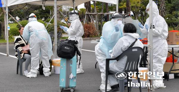 지난해 3월 30일 코로나19 유입 차단을 위해 제주로 입국한 내외국인들을 대상으로 검사를 하는 ‘제주공항 워킹 스루 진료소(개방형 선별진료소)’