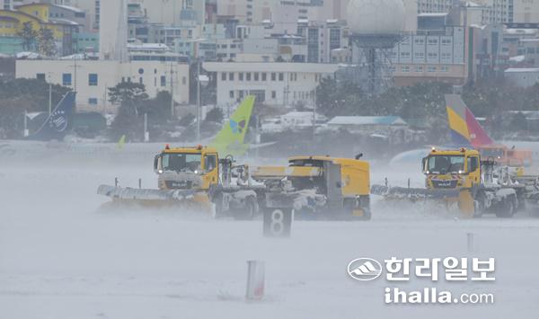 폭설과 강풍으로 항공기 운항이 중단된 8일 오후 제주국제공항 계류장에서 한국공항공사 특수차량이 제설작업을 하고 있다. 강희만기자