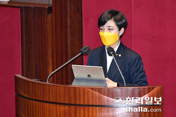 정의당 류호정 의원이 8일 오후 서울 여의도 국회에서 열린 본회의에서 중대재해 처벌 등에 관한 법률안 찬성토론을 하고 있다. 연합뉴스