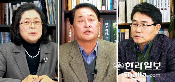 사진 왼쪽부터 김정숙 제주녹색소비자연대 공동대표, 송창우 제주와미래연구원장, 한승철 제주연구원 연구위원