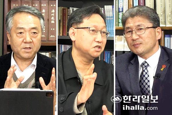 왼쪽부터 김태윤 제주연구원 선임연구위원, 강호진 제주대안연구공동체 공공정책센터장, 이상봉 제주특별자치도의회 행정자치위원장.