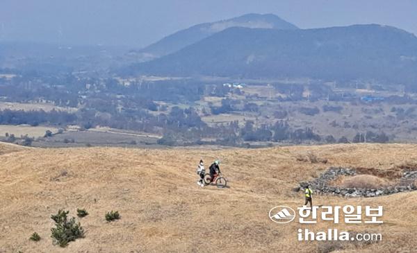자전거를 이용해 오름을 탐방하는 관광객.