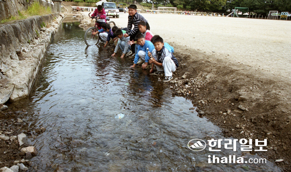 | 1999년 가을 비가 많이 내리면서 위미초등학교 운동장에 물이 넘쳐나자 어린이들이 신기한 듯 물가에서 놀고 있다. |