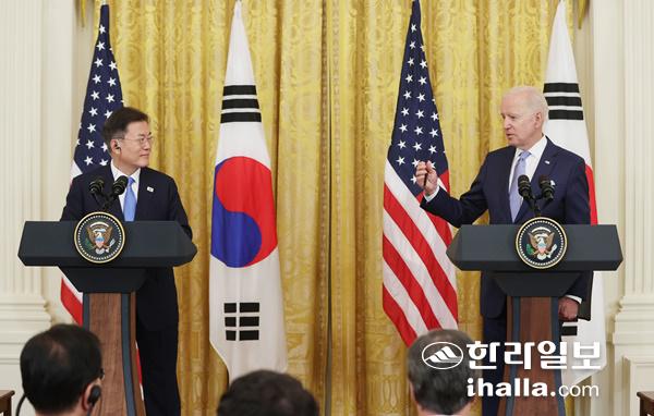 문재인 대통령과 조 바이든 미국 대통령이 21일 오후(현지시간) 백악관에서 정상회담 후 공동기자회견을 하고 있다. 연합뉴스