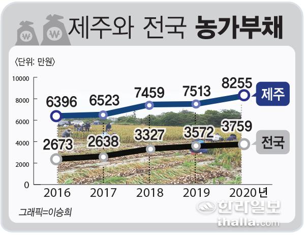 전국에서 부동의 1위를 유지하고 있는 제주지역의 농가부채 증가율이 지난해 10%에 근접하며 가구당 부채가 처음으로 8000만원을 넘어섰다. 제주는 농가 부채와 함께 자산과 가계지출도 전국에서 가장 높았다.