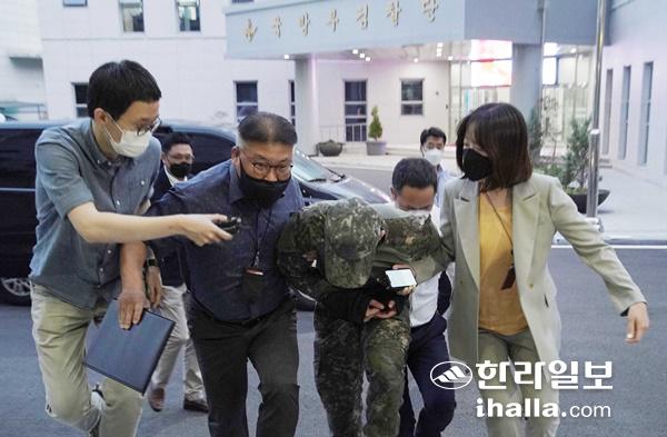 극단적 선택을 한 공군 여성 부사관을 성추행한 혐의를 받는 장 모 중사가 2일 저녁 구속영장실질심사를 받기 위해 국방부 보통군사법원에 압송되고 있다. 연합뉴스