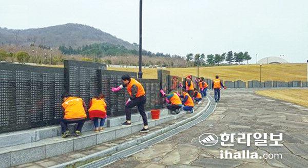 제주4·3평화공원에서 환경정화활동을 펼치고 있는 한화리조트 제주 임직원들.