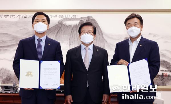 더불어민주당 윤호중 원내대표와 국민의힘 김기현 원내대표는 이날 오전 국회에서 박병석 국회의장 주재로 만나 약 1시간 동안 논의한 끝에 이같은 방안에 합의했다.