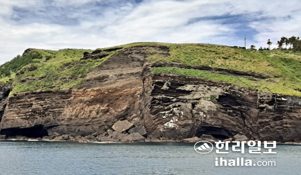 | 마라도 여객선에서 바라본 송악산의 모습. 아름다운 절경이지만 해안절벽 곳곳에서 붕괴현상이 잇따르며 체계적인 중장기 보전방안 마련 및 안전문제에 대한 고민이 필요하다. 강희만 기자 |