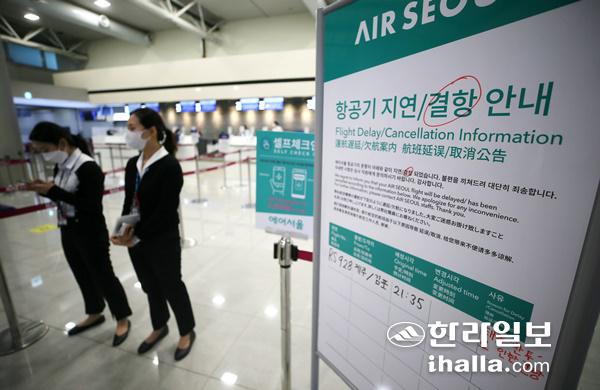 태풍 '찬투'가 제주를 향해 접근하는 16일 오후 제주국제공항 출발 대합실에 항공기 결항을 알리는 안내 문구가 걸려있다. 연합뉴스