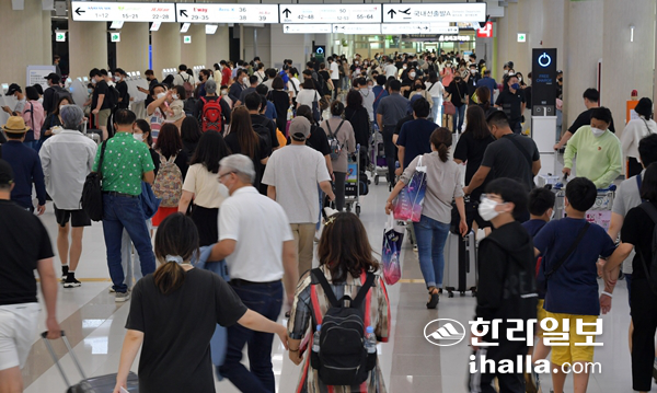 제주공항에는 입도 행렬도 이어졌다. 제주공항 도착장 게이트를 통해 여행캐리어를 끌고 나오는 관광객이 밀물처럼 쏟아져 나왔다.