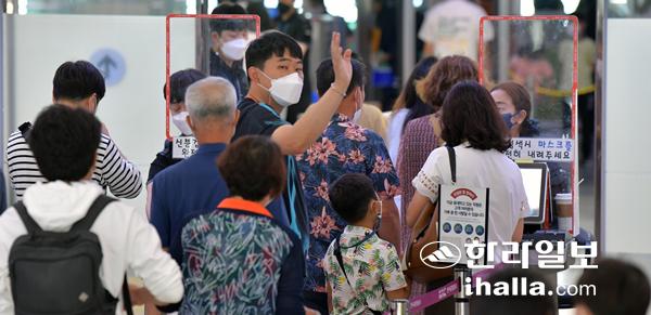 추석 연휴 마지막 날인 22일 제주국제공항 2층 국내선 출발 대합실은 귀경객과 관광객들의 발길이 이어졌고 이들은 탑승 수속을 하기 위해 길게 줄을 선채 대화를 최대한 자제했다. 특히 이번 추석은 코로나19로 고향 방문 자제 분위기가 확산되면서 가족과 아쉬운 작별 인사를 나누고 돌아가는 귀경객들의 모습은 거의 찾아볼 수 없었다. 대신 공항을 찾은 귀경객들은 차량에 탑승해 있는 가족들과 창문 넘어 짧은 인사를 나누고 곧바로 공항 안으로 향하기도 했다.