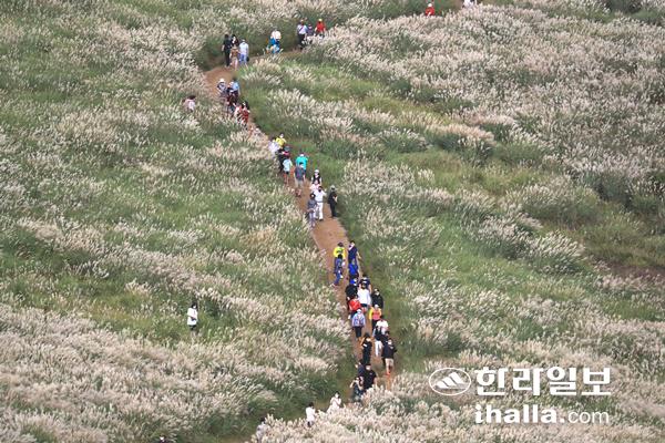 10일 오전 제주시 애월읍 봉성리 새별오름을 찾은 관광객들이 활짝 핀 억새꽃과 함께 가을 정취를 즐기고 있다. 연합뉴스