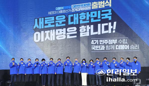 더불어민주당 이재명 대선후보가 2일 오후 서울 송파구 올림픽경기장 KSPO돔에서 열린 더불어민주당 제20대 대통령선거 선거대책위원회 출범식에서 선대위원장들과 함께 승리를 위한 퍼포먼스를 하고 있다. 연합뉴스